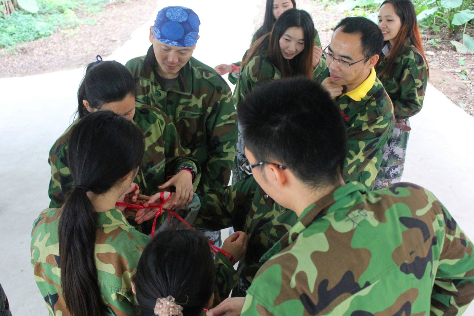 早上十一點(diǎn),在綿綿細(xì)雨中戶(hù)外拓展訓(xùn)練正式拉開(kāi)帷幕。開(kāi)班前,教練通過(guò)跳《社會(huì)搖》舞蹈、解鎖連環(huán)繩等一系列的歡快活動(dòng)來(lái)營(yíng)造氣氛,建立彼此信任的基礎(chǔ)。